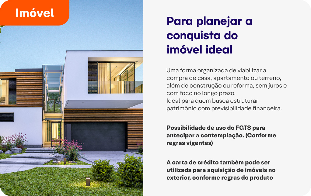 No consórcio de imóvel, por exemplo, a carta de crédito pode ser utilizada para comprar casa, apartamento ou terreno, construir, ou até mesmo reformar, ampliando as possibilidades de uso conforme o seu objetivo.