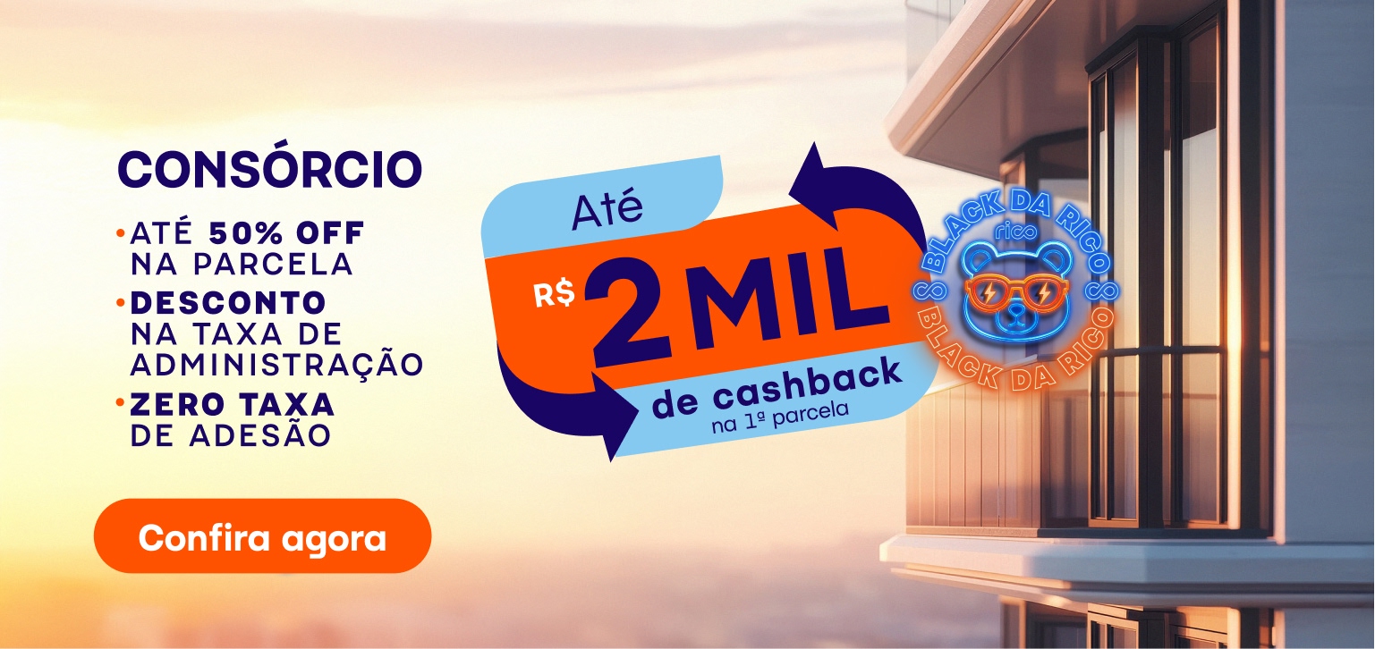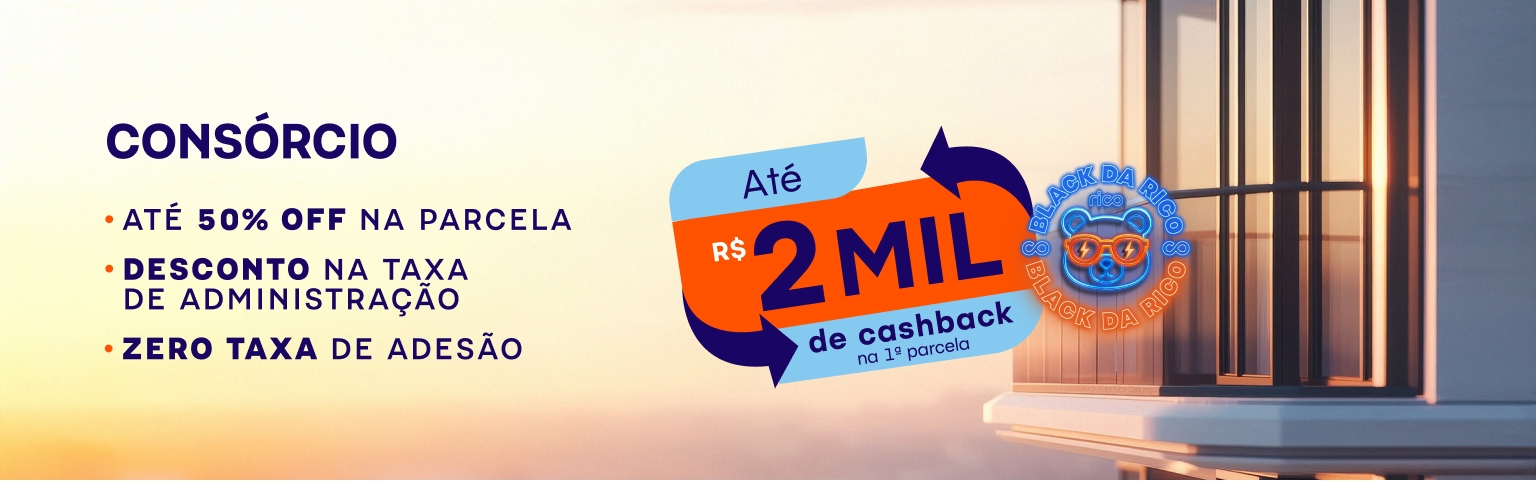 Com o Consórcio Rico, você conquista seu bem sem entrada, sem juros e agora com até R$2 mil de cashback na 1ª parcela.